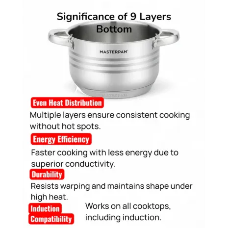 Ο καινοτόμος πάτος 9 στρώσεων, με συνδυασμό αλουμινίου και σιδήρου, εξασφαλίζει ταχεία και ομοιόμορφη κατανομή θερμότητας, για τέλειο ψήσιμο χωρίς καψίματα.
