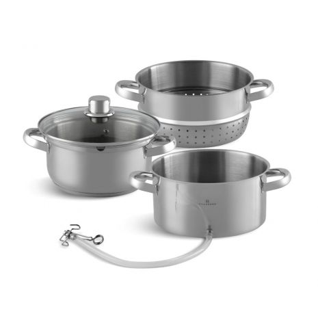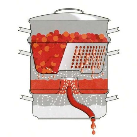 Από τον σωλήνα που βρίσκεται στο πλάι εξάγεται ο χυμός. Η δράση των υδρατμών επιτρέπει την εξαγωγή του χυμού χωρίς να χάνονται βιταμίνες ή γεύση κατά την διάρκεια του μαγειρέματος.
